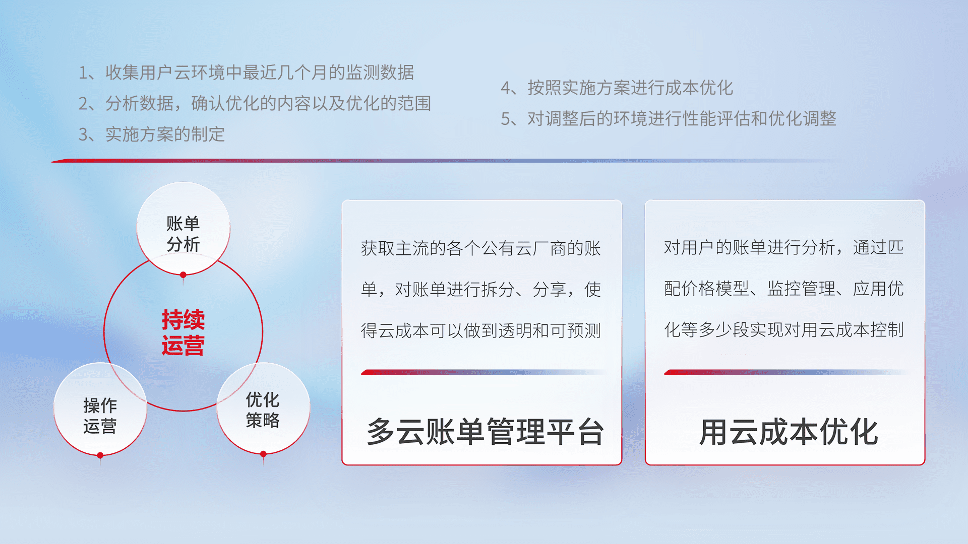 通过多云纳管,,,以统一的资源数据模型把客户的云资源进行抽象和封装,,进而实现对多云资源的统一操作,,,保障云资源管理的可靠性、、稳定性与可用性。。量身定制化运维内容,,,配置、、开发运维、、、补丁管理、、、、备份、、、监控、、、、认证和访问管理、、、、审计和日常巡检等,,保障在用云过程中的可靠度,,,,稳定度以及高可用率。。